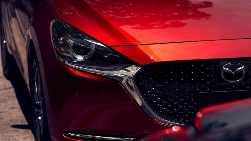 La principal novedad del Mazda2 2020 consiste en el frente que adopta defensas y parrilla de nueva manufactura, esta última, presume un diseño que se pone a tono con lo visto en modelos como el Mazda6 o CX-30 (No confundir con CX-3). Los faros son más delgados e incluyen tecnología LED con iluminación en curva. Las llantas de 16 pulgadas también cambiaron para bien.