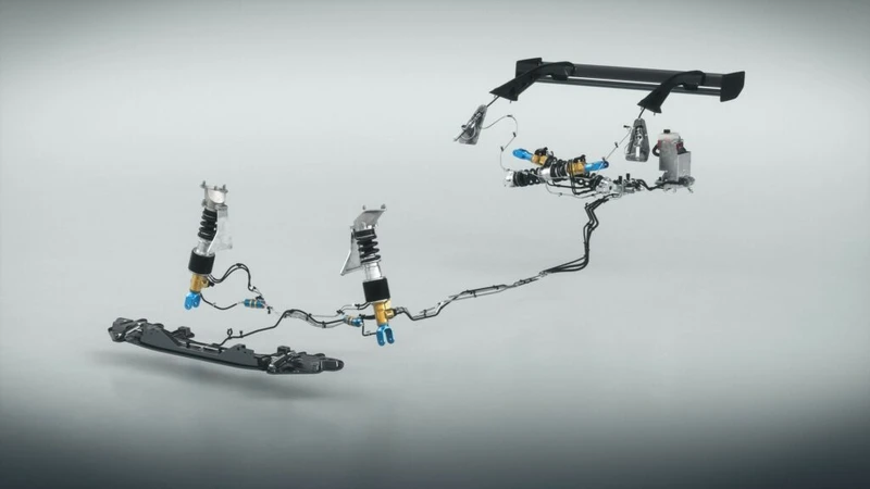 - Suspensión de carrera semi-activa, con dampers activos y sistema hidráulico para regular la altura y dureza. El esquema posterior del tipo "pushrod" se montó en una subestructura posterior, o sea ni por si acaso tendrá el mismo comportamiento dinámico de un auto americano.